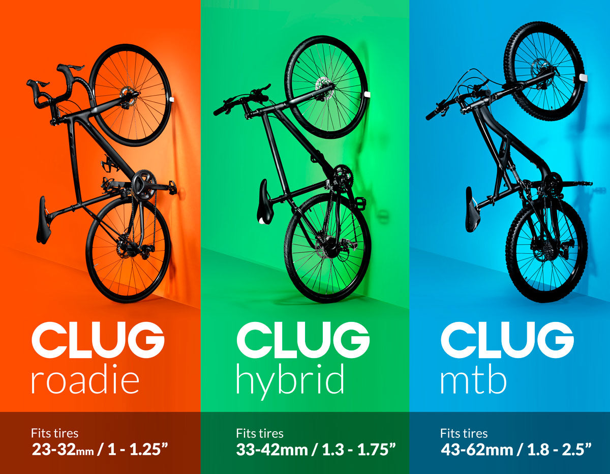 CLUG comes in a bunch of different colours and three sizes to fit different sized tires: Roadie for the road riders out there on their skinny slicks, MTB for the downhillers on their big knobby tires and Hybrid for everyone on those sizes in between.